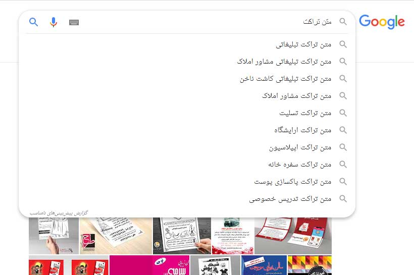همون طور که در این تصویر ملاحظه میکنین ، ظاهرا کسب و کارهای زیر که در تصویر بالا هم اومده ، بیشتر دنبال متن تراکت برای طراحی تراکت و چاپ تراکت کسب و کار خودشون بودن ، وقتی “متن تراکت” رو در گوگل جستجو کنین ،  گوگل بهتون پیشنهاد میکنه از موارد زیر هم که بیشتر توسط مردم جستجو شده انتخاب کنین